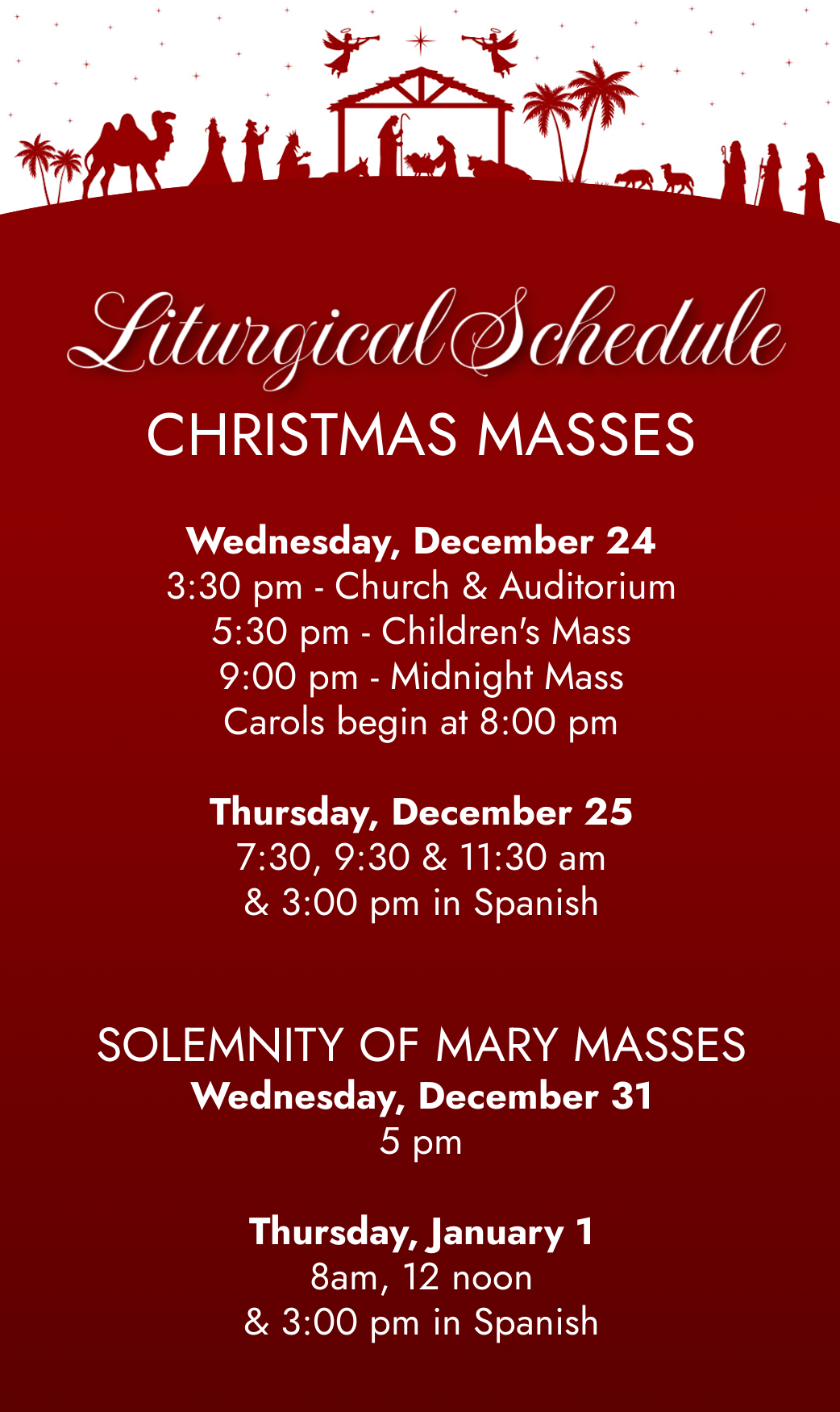 Sunday: 7:30am, 9:30am, 11:30am, 5pm.